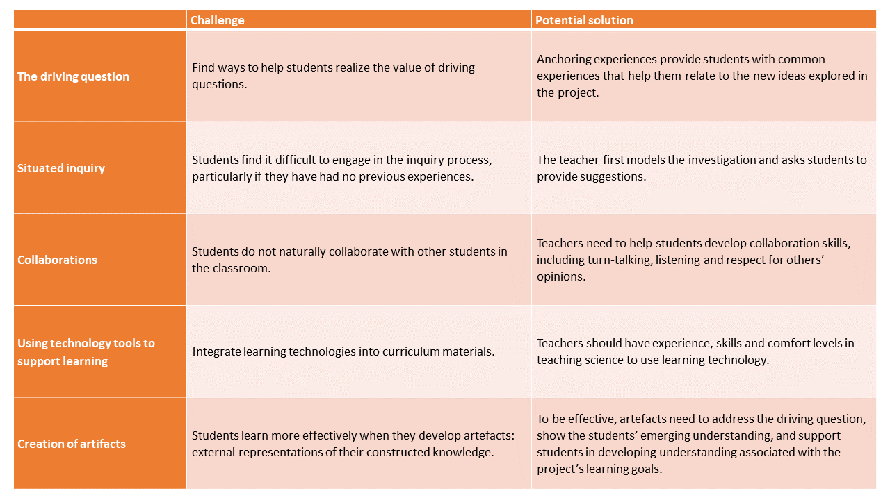 Adapted from Krajcik JS, Blumenfeld PC. Project Based Learning at Sawyer, R. (Ed.). (2014). The Cambridge Handbook of the Learning Sciences (2nd ed., Cambridge Handbooks in Psychology). Cambridge: Cambridge University Press. doi:10.1017/CBO9781139519526